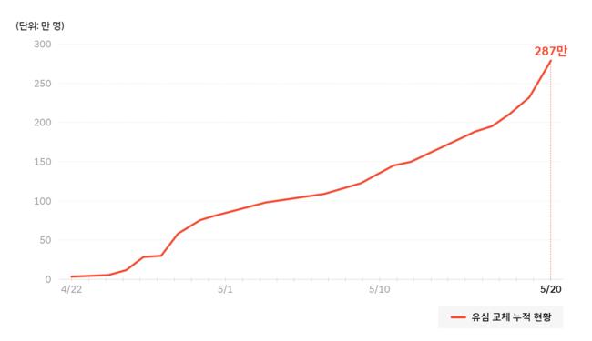 SK텔레콤은 2025년 5월 21일 0시 기준으로 누적 유심 교체 고객 수가 287만 명에 달했다고 밝혔다. 이 가운데 5월 20일 하루 동안만 35만 명이 유심을 교체한 것으로 나타났다. 같은 날 기준 유심 교체를 예약한 고객은 총 601만 명으로 집계됐다.